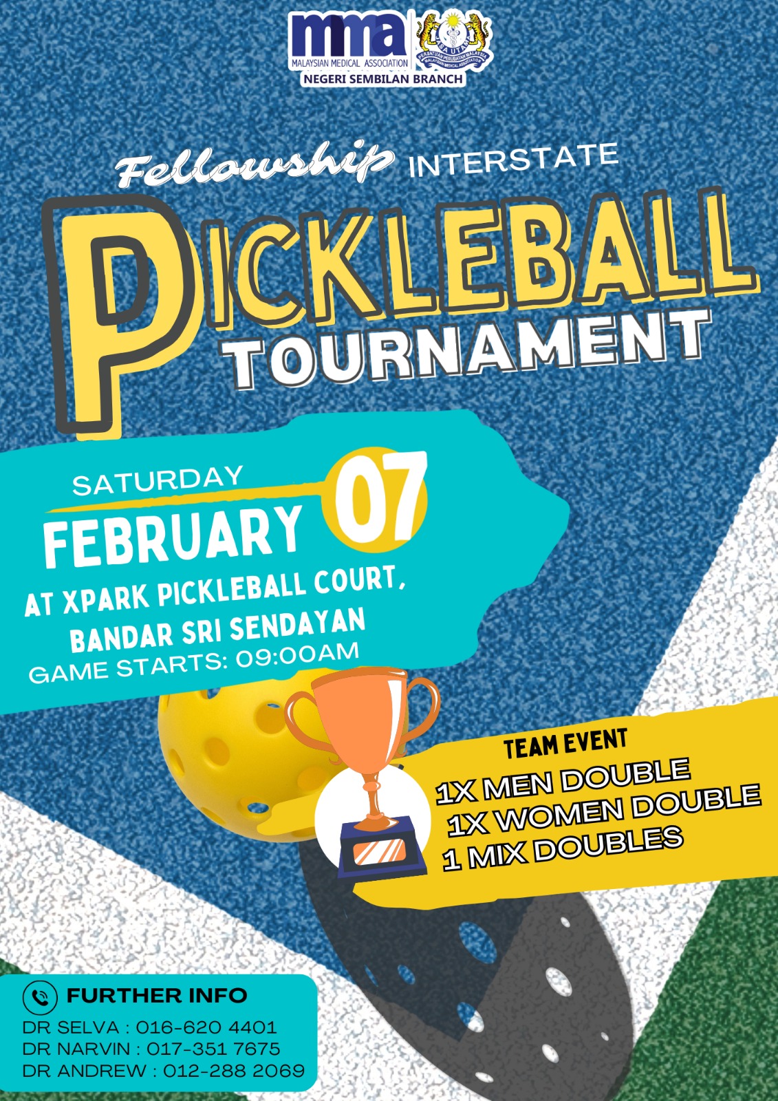 On behalf of MMA Negeri Sembilan, we are pleased to invite MMA members from MMA Wilayah Persekutuan (WP) to participate in the Fellowship Interstate Pickleball Tournament. This tournament is organised to strengthen camaraderie, promote fellowship, and encourage a healthy and active lifestyle among MMA members.