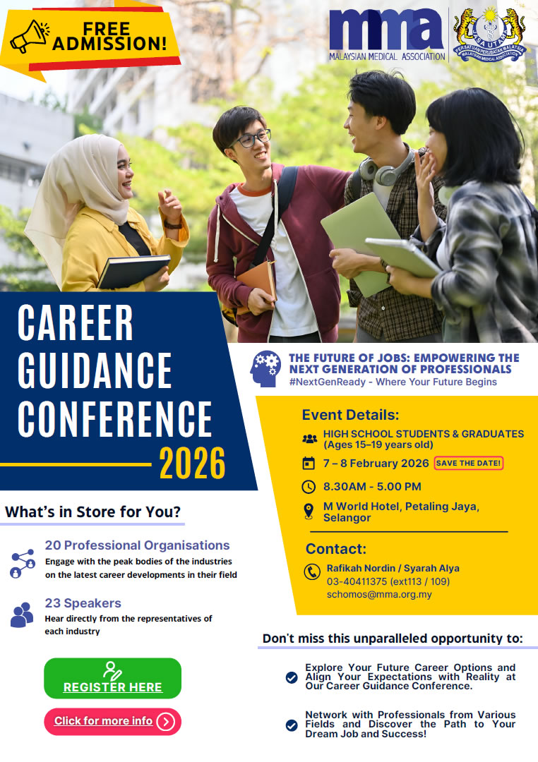 With reference to the above matter, we are pleased to invite all MMA Members to attend the Malaysian Medical Association’s Career Guidance Conference (MMA CGC) 2026.