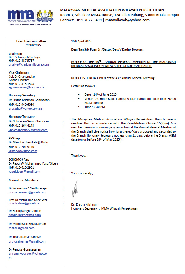 The Malaysian Medical Association (MMA) Wilayah Persekutuan Branch cordially invites all members to attend the 43rd Annual General Meeting (AGM) of the Branch.
