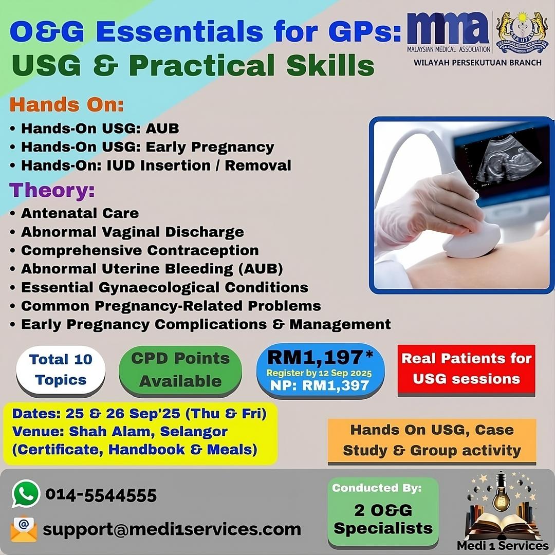 MMA Wilayah Persekutuan Branch is pleased to share the upcoming O&G Essentials for GPs: USG & Practical Skills Workshop, organised by Medi 1 Services.