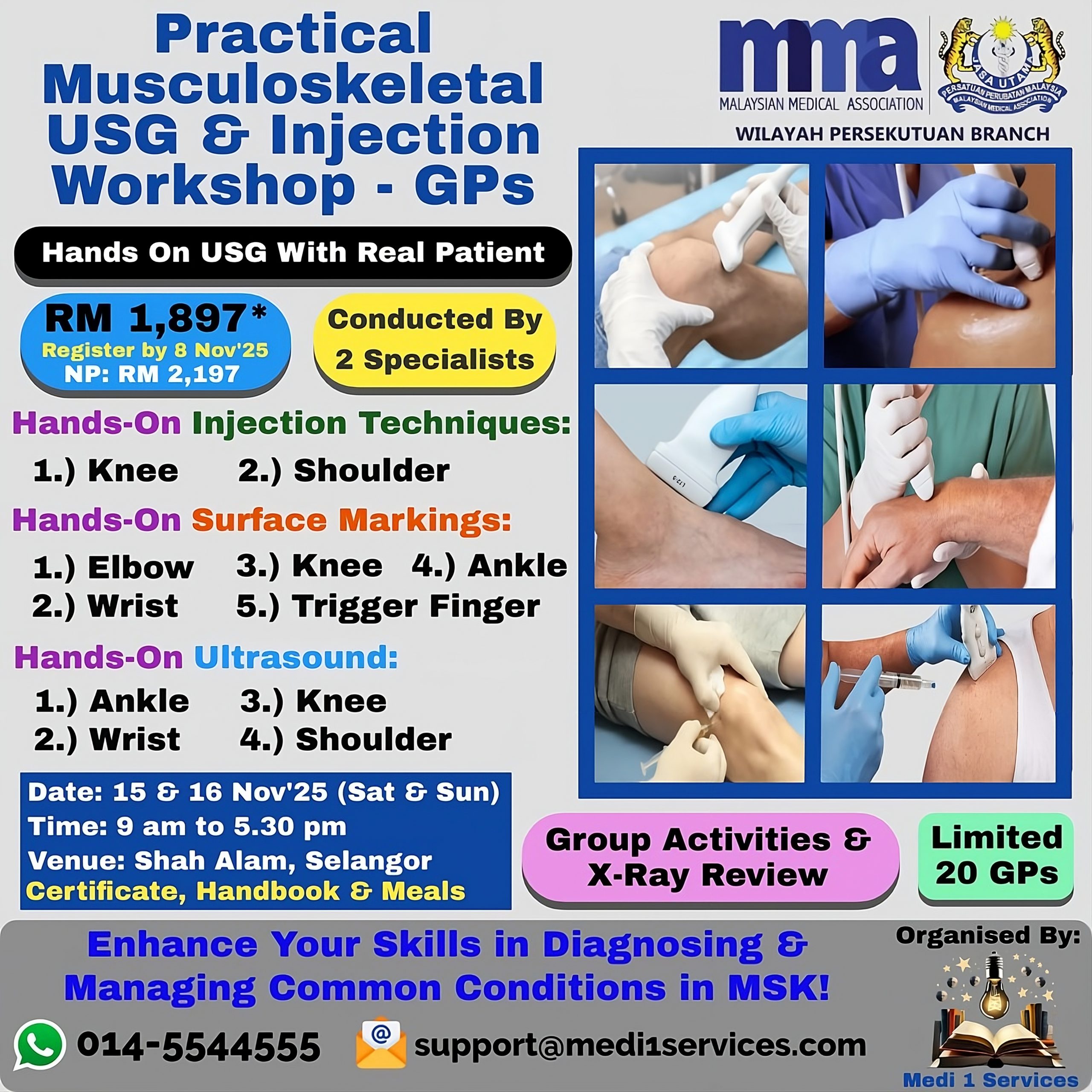 MMA Wilayah Persekutuan Branch is pleased to share the Practical Musculoskeletal USG & Injection Workshop for GPs, organised by Medi 1 Services.